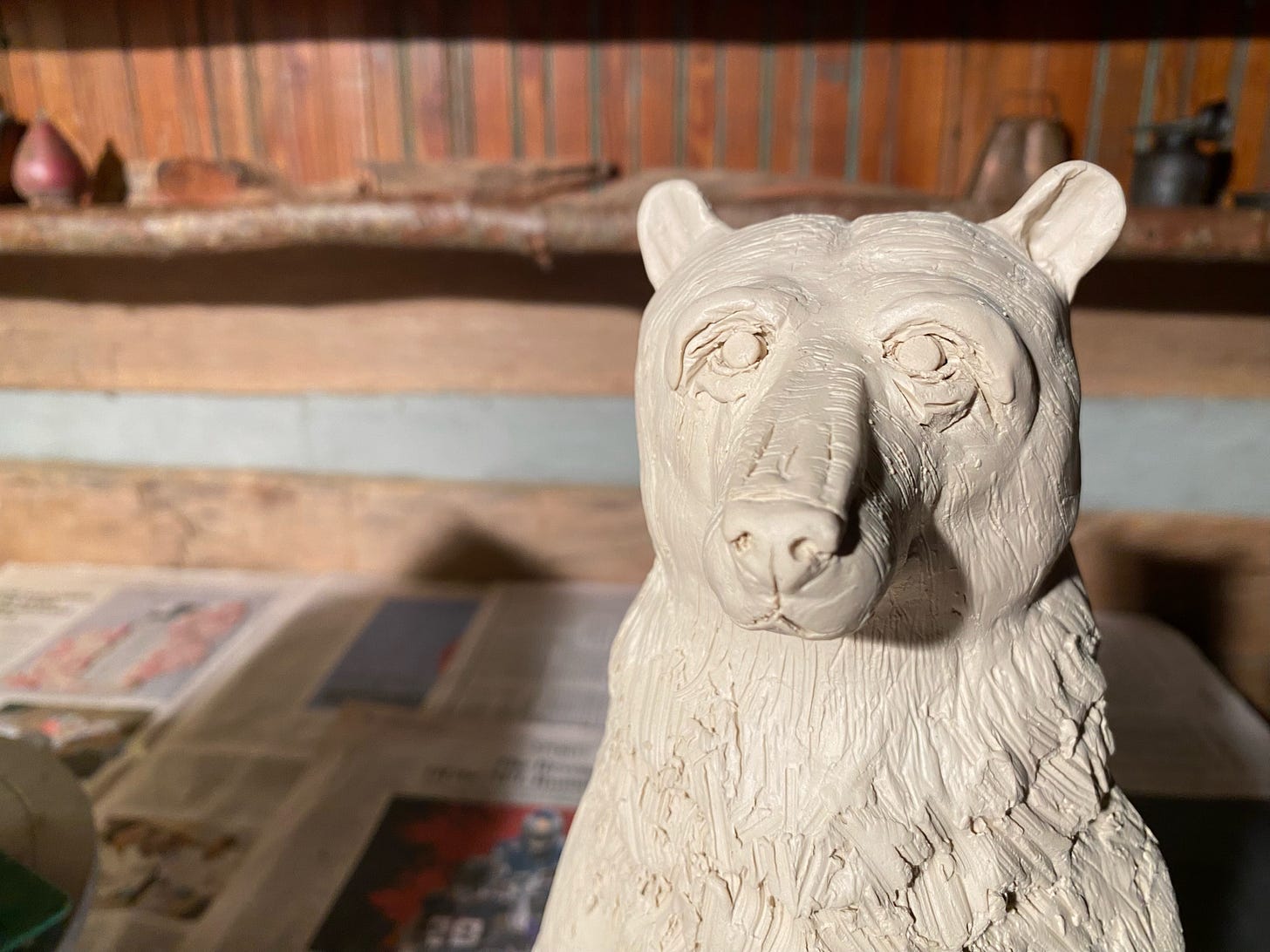 Now it is late October, and I have just returned from a clay sculpting workshop that I circle back to every year. The first year, we made ravens and owls. The second year, we made hares. This year, we made bears. Mine started out as a giant sweet potato body with a one-inch collar where its neck would be and a round pinch pot for its head. Four thick pillars that would become the bear’s legs went under that, along with a pedestal of clay to keep the whole thing from sagging in the middle until it had hardened enough to stand alone.